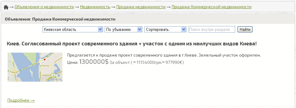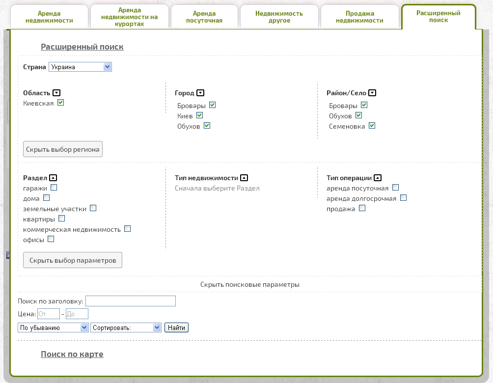 У нас возможен поиск с разделением по множеству параметров, в том числе районам, населенным пунктам, цене, типу объявления, характеристикам объектов и прочему.